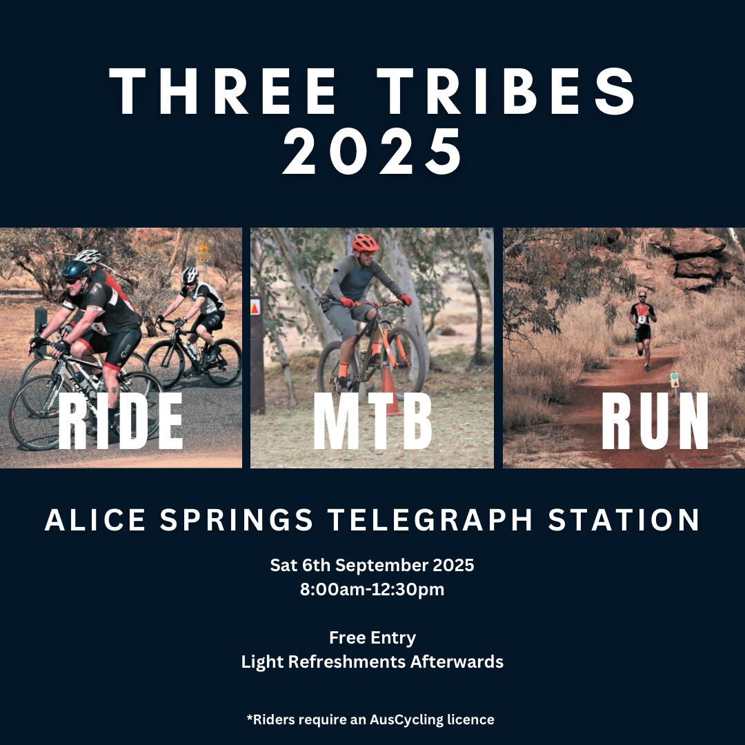 Three Tribes brings together three clubs presenting three sporting disciplines in one fun event, followed by a family social get together at the telegraph station. The run leg of this event is coordinated by the Alice Springs Running and Walking Club, the MTB leg by Central Australian Rough Riders and the road leg by Alice Springs Cycling Club.